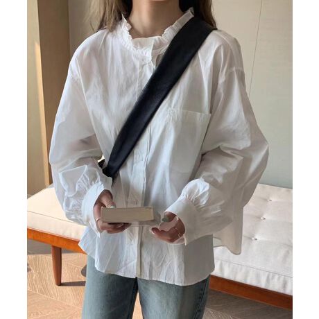襟元のフリルデザインが上品で可愛らしい印象を与えるコットンシャツ。**綿100%**素材を使用しており、柔らかな肌触りと通気性の良さが快適な着心地を提供します。シンプルなディテールの中に女性らしさが光る一枚です。