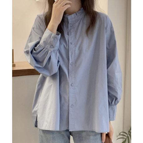 襟元のフリルデザインが上品で可愛らしい印象を与えるコットンシャツ。**綿100%**素材を使用しており、柔らかな肌触りと通気性の良さが快適な着心地を提供します。シンプルなディテールの中に女性らしさが光る一枚です。