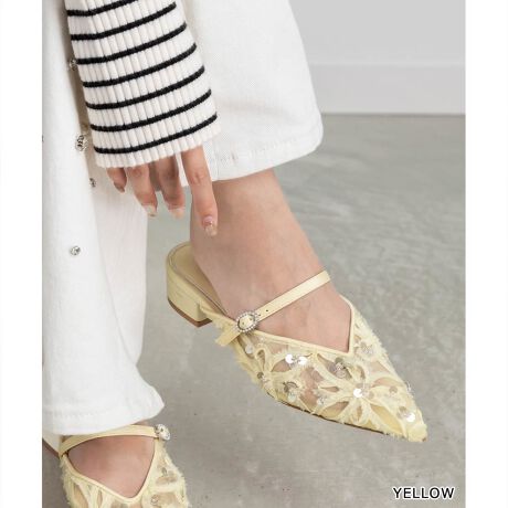 さりげなく輝くスパンコールを施したフラットミュールパンプス。