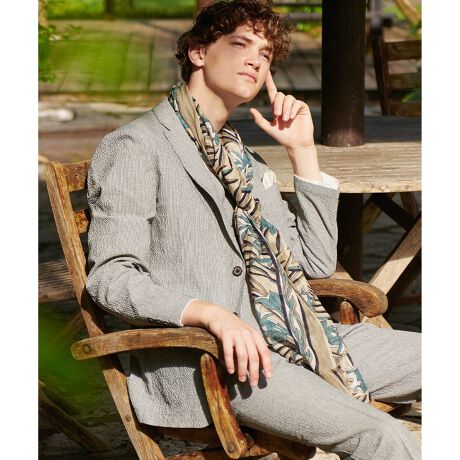 ■素材UV加工(紫外線対策)と有害物質を含まず、環境に優しい新たなフッ素非配合のテフロンECOエリート撥水加工を施し、イージーケア(ウォッシャブル)/防シワ/ストレッチ/軽量/速乾性を兼ね備えた多機能のライトウェーブをさらに薄く、涼しさを感じていただける素材に新開発!ライトウェーブライト素材が誕生しました。ベース生地のストライプの巾を狭くし、凹凸感を若干抑えることで従来のライトウェーブ素材に比べて肉感を薄く仕上げました。2WAYストレッチで全方向に伸び、快適な着心地が特徴のサッカー素材を使用。特殊撚糸で生産したポリエステル糸のドライ感とシアサッカーの凹凸感で肌離れが良くベタつきを感じにくい素材です。ベース生地を一度染色し、生地の表面に織り柄をプリント加工しJOSEPH ABBOUDらしい先染め調でミックス感のある色目表現をしています。