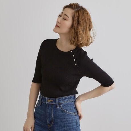 多釦ビジューが大人可愛い リブニットプルオーバー