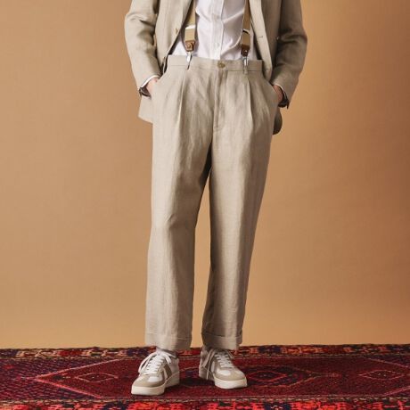 コンパクトなジャケットに対してワイドスラックスという合わせの妙を是非ご堪能ください。
