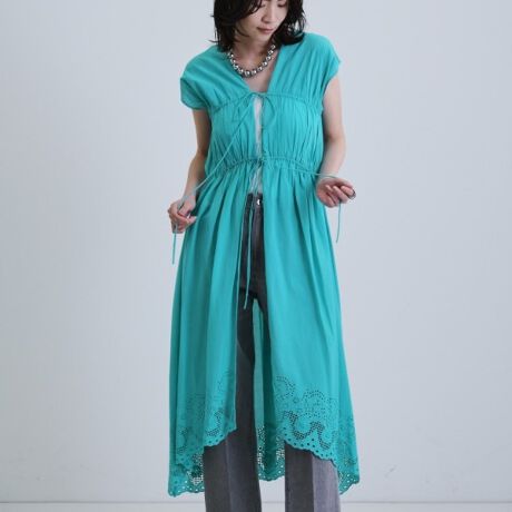 裾のレースディテールがフェミニンなアクセントを加え、洗練された印象を与えます。