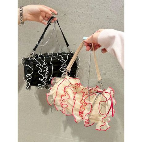 大胆なメローフリルとギャザーをあしらった、視線を集めること間違いなしのデザインバッグ。筒型のバレルバッグの形で、トレンド感を取り入れた洗練された仕上がりになっています。チェーンとハンドルは取り外し可能で、ショルダーバッグとしてもハンドバッグとしても使用可能。スマホ、お財布、ポーチが収まるちょうど良いサイズ感で、普段使いからお出かけまで幅広いシーンで活躍します。ブラックは身生地にレースを使用し、ホワイトのメローフリルでコントラストを効かせた華やかなデザイン。ベージュはほんのり輝くブライトチュールにレッドのメローフリルを組み合わせた女性らしい印象に。トレンドのレオパード柄は、透け感のあるチュールを使用することで軽やかさを演出し、重くなりすぎない絶妙なバランスが特徴です。