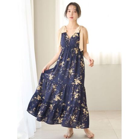 長さ調整できるショルダーリボンのアクセントがキュートな、カップインタイプのロングワンピース。