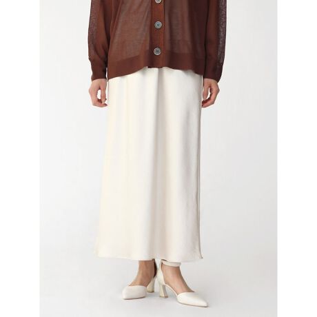 シルクのような光沢感と滑らかな質感が特徴のサテン生地を使用。しなやかなドレープ性があり、すっきりとした落ち感がこなれた印象へと後押しします。