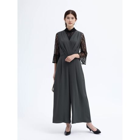 オールインワンにはウエスト周りにタックを施すことでメリハリのあるスタイルに仕上げ、ざっくりと開いた首元が女性らしさをプラス。