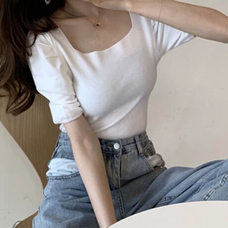 さりげなく可愛さを格上げしてくれるパフスリーブショート丈ニットトップス