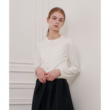短めの着丈とパフスリーブ、たくさん付いたドット釦がポイントです。