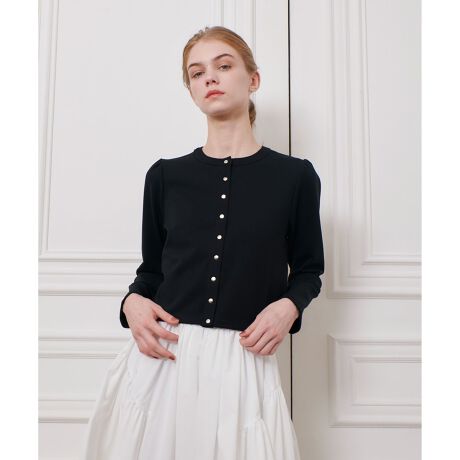短めの着丈とパフスリーブ、たくさん付いたドット釦がポイントです。