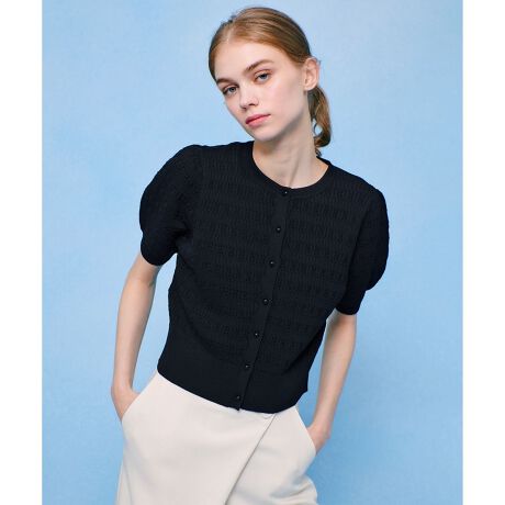 リボンを編み込んだような特殊な編地を使用した半袖カーディガン。