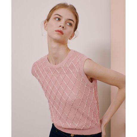 スパンコールを織り込んだキラッとした糸を格子柄のように刺繍したプルオーバー。
