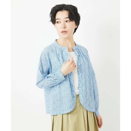 リバティの柄と相まって愛らしいブラウスです。バンドカラーがきりっとさせ 全体はライトなフェミニンさを感じるデザインに。