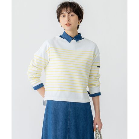軽やかな配色のパネルボーダーが目を引くプルオーバー。昨年のモデルよりも短めな、ほど良いクロップド丈で、パンツにもスカートにも合わせやすい丈感なので、ボトムを選ばず着回しやすい一枚です。 サイドスリットを入れることで立体的なシルエットに仕上げ、コーディネートにメリハリをプラスします。ボトムに前をインしても、アウトにしてもバランスの良いデザインです。春から夏にかけて映える4色展開で、デニムと相性抜群なオフ×トマト(#110)、ヘルシーな印象のオフ×レモインエロー(#142)、ニュアンス感のあるオフ×エメラルド(#164)、ブラックのボーダーが引き締まった雰囲気のベージュ×ブラック(#233)のラインナップです。