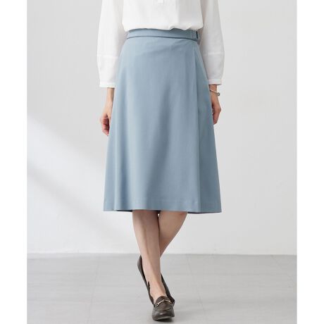 ■デザインバックルディテールがポイントのAラインスカート。後ろはゴム入りで穿きやすい仕様で、膝が隠れるぐらいの安心感のあるレングスです。トップスをインでもアウトでもポイントとなるベルト下のパイピングテープもワンポイントになっています。きれいめからカジュアルまで、幅広いシーンで楽しめるスカートです。総裏です。
