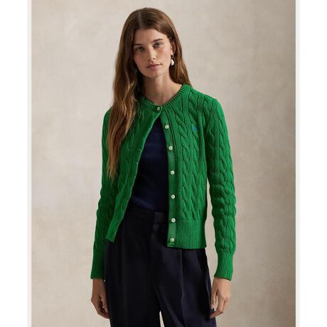 ピュアコットンを使用したケーブルニットのスリムなクルーネックカーディガン。胸にあしらったシグネチャーのポニー刺繍で仕上げたアイテム。・スリムフィット / 腰丈・リブニットのクルーネック / グログラントリムをあしらったボタン付き前立て・長袖、リブニットのカフス・リブニットの裾・左胸にシグネチャーのポニー刺繍・モデル身長178cm、着用サイズS 【素材】・本体:綿 100% 装飾部分を除く【生産国】カンボジア