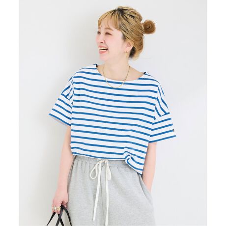 露出しすぎず二の腕をカバーする丈感やボートネックで大人カジュアルに着やすいすっきり見えするデザインになっています。