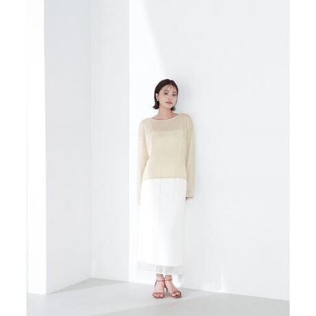 シアーな素材がトレンド感を出し、コーディネートに軽さをプラスしながらいっきに春らしくアップデートできるナロースカート。シアー素材の内側には肉厚な合繊素材を使用しているので着心地も良いです。ウエストはグログランゴム仕様でキレイにフィットしつつ高見えするデザイン。後ろはセンタースリットが入っているので歩きやすさも◎。<素材>ベースにリサイクルポリエステルを一部使用したサスティナブルな素材。滑らかなオーガンジー素材を上に重ねています。<詳細>仕様・後ろファスナー裏地・なし透け感・ややあり / 光沢・ややあり / 伸縮性・なし 生地の厚さ・普通※モデルの着用画像の場合、光の当たり具合により、実際の色味と異なって見えることがございます。色味は、商品単体の画像をご参照ください。