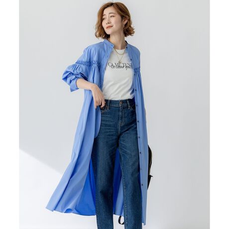 ピンタックディテールを上身頃にぐるりと施した、ロング丈の長袖ワンピース。バンドカラーで肩回りはすっきりとした作りに対して、胸元のピンタックの切り替えから裾に向かってギャザーフレアをたっぷりと出すことで、シンプル過ぎず程よく華やかなデザイン性を加えながら、体のラインを拾わずゆったりとしたリラックス感のあるシルエットに仕上げています。見た目の分量感よりも軽やかな素材で、長いシーズンで活躍してくれる1枚です。フロントボタンを開けてインナーにカットソーやボトムを合わせたレイヤードスタイルも楽しめます。カラーは、爽やかな印象のブルー(#070)、洒落感のあるベージュ(#033)、シックな雰囲気のブラック(#005)の3色展開です。