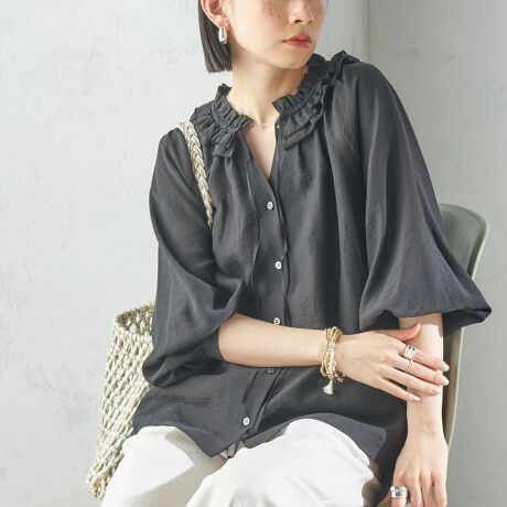 程良い襟の開きとシアー感のある素材がスタイリングに抜け感をプラスしてくれます。