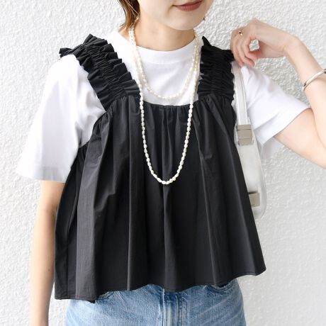 太めのフリルをあしらった肩紐はシンプルなTシャツやニットとのレイヤードに映えます。