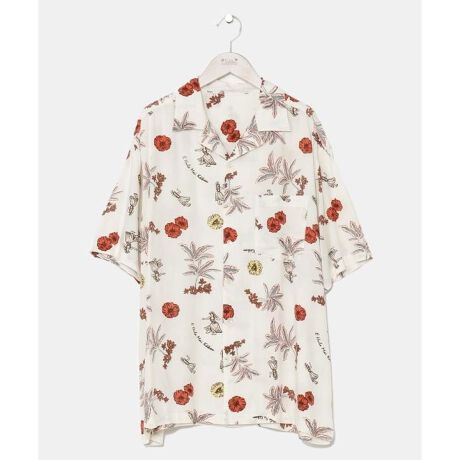 [型番:4IA-5110-2025]ハワイのイメージが描かれたチャプスイ柄のメンズアロハシャツ。ナチュラルでヴィンテージ感のあるデザインです。レーヨン素材でさらっと着られます。ユニセックスで着用可能。