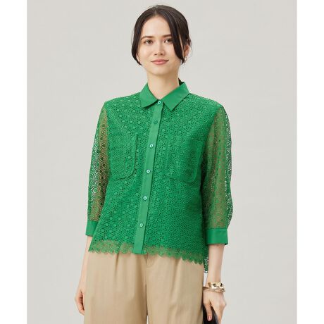 お花をイメージした幾何学柄レースのクロップド丈ブラウス■デザイントレンド感がありながらも短すぎない、程よいバランスのクロップド丈ブラウスです。襟、前立て、カフスをレースと同色の無地生地でブロッキングし、素材のコントラストを効かせたデザインです。胸ポケットや、裾のスカラップもポイントです。釦を開けて羽織りとしても着て頂けます。エレガントすぎない柄でデイリーに着回すことができ、シンプルなボトムに合わせるだけで華やかなコーディネートが完成します。ロンドンにある花屋Matsurika Flowers(マツリカフラワー)とのコラボレーションアイテムです。【Matsurika Flowers】ロンドンを拠点に活動する日本人フローラルデザイナーMariko KinoshitaさんによるMatsurika Flowers。花が持つナチュラルな美しさを生かし、世界の歴史やカルチャーを着想源に、ビンテージとアンティークを組み合わせたスタイルが人気です。ウェディングやイベントでフラワーアレンジメントを手がけるほか、ワークショップも開催しています。■素材お花をイメージした、サークルの幾何柄レース生地です。刺繍の技法を用いて、繊細かつ膨らみがあり、高級感のある透かし模様に仕上げました。絹ライクなポリエステル糸を使用しているので、さらりとした快適な着心地です。■同素材アイテムプルオーバーブラウス(BLWRGM0310)