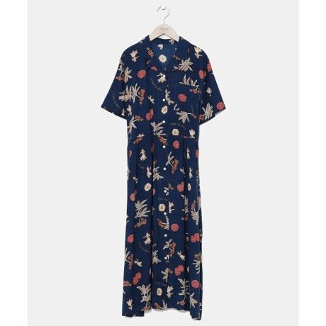 ハワイのイメージが描かれたチャプスイ柄のシャツワンピース。ナチュラルでヴィンテージ感のあるデザインです。レーヨン素材でさらっと着られるため、ボタンを開けて羽織るのもおすすめ。