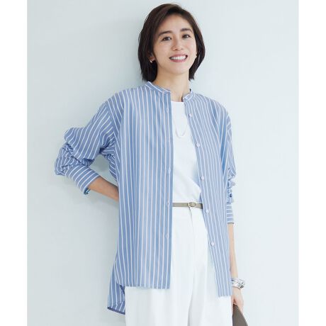しなやかな落ち感のある女性らしい素材のバンドカラーブラウス■デザインシンプルなバンドカラーのブラウスです。肩幅と身頃に程よくゆとりを持たせ、しなやかな素材の落ち感と相まって大人っぽい抜け感を感じられるシルエットに仕上げました。1枚ではもちろん、コンパクトなバンドカラーでニットのインナーとしてレイヤードしてもバランス良く着て頂けます。無地2色とストライプ2色の展開で、ラメブルーストライプ(173)カラーは、ストライプの白地に繊細なシルバーのラメを施しております。※画像はサンプルを使用しております。実際にお届けする商品は、ラメブルーストライプ(173)カラーのボタンホールが表地と同じブルーになります。■素材ポルトガルのSOMELOS社で織り上げた、セルロース系再生繊維のブラウス素材です。ストライプは自由区別注柄です。丁寧に織り上げられ、しなやかさ、ドレープ感、程よいハリ感の全てがバランス良く計算しつくされた仕上がりとなっております。ソフトな風合いで肌触りが柔らかく、シルクのような光沢感、清涼感があるため着心地の良い素材です。■同素材アイテムチュニックブラウス(BLWRGM0312)クロップド丈ブラウス(BLWRGM0313)