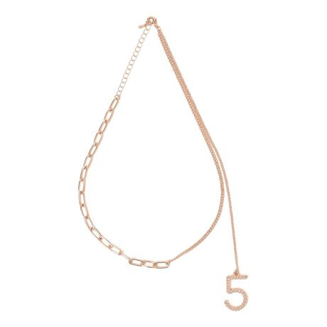 大きさを切り替えたチェーンネックレスで、5のチャームはフロントに持ってきても、バックに垂らしても使用できるデザインです。