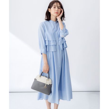 ■デザインブラウスで大好評のランダムフリルのティアードのワンピースです。バックスタイルにもブラウス部分もふらして360度抜け目のないデザイン。大胆なボリュームのフリルなので甘くなりすぎないように、全体のシルエットや襟や袖の形状など、少しだけモードな要素を取り入れています。釦を閉めて着たときに襟元が詰まりすぎないように、程よく首周りにゆとりを持たせ、すっきりとした印象にしたことで、1枚でも羽織りでも着こなしの幅が広いワンピースです。スタイリングによって綺麗めからカジュアルまで雰囲気をかえられる万能さも嬉しいポイント。両サイドにはスリットポケットがあります。裏地はなし・アンダースカート付きです。