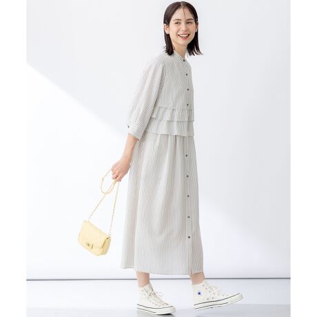 ■デザインブラウスで大好評のランダムフリルのティアードのワンピースです。バックスタイルにもブラウス部分もふらして360度抜け目のないデザイン。大胆なボリュームのフリルなので甘くなりすぎないように、全体のシルエットや襟や袖の形状など、少しだけモードな要素を取り入れています。釦を閉めて着たときに襟元が詰まりすぎないように、程よく首周りにゆとりを持たせ、すっきりとした印象にしたことで、1枚でも羽織りでも着こなしの幅が広いワンピースです。スタイリングによって綺麗めからカジュアルまで雰囲気をかえられる万能さも嬉しいポイント。両サイドにはスリットポケットがあります。裏地はなし・アンダースカート付きです。