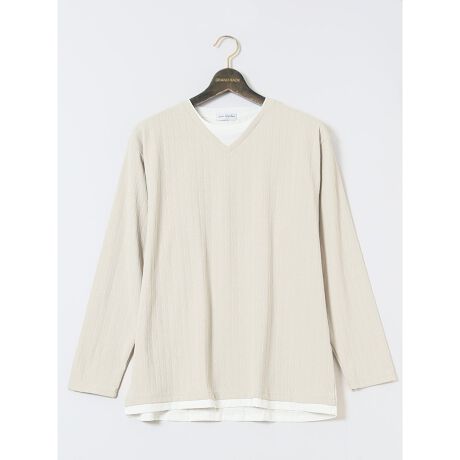 トップスを二枚重ね着したように見える、衿変化の長袖Tシャツです。衿・裾部分のフェイクレイヤードで高見えするルックスに仕上げています。一枚で着るのはもちろん、ジャケットやシャツ、ベストのインナーとしても便利なアイテムです。