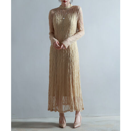オーバードレスはワッシャー加工のような立体感のある柔らかな風合いの総レースワンピースです。ボディラインに沿ったマーメイドに近いシルエットで、女性らしいエレガントなラインを描きます。