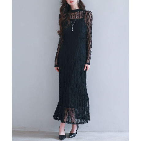 オーバードレスはワッシャー加工のような立体感のある柔らかな風合いの総レースワンピースです。ボディラインに沿ったマーメイドに近いシルエットで、女性らしいエレガントなラインを描きます。