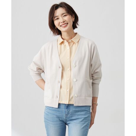 ■デザイン貝釦が春らしいドルマンスリーブカーディガン。肩から袖にかけてのドレープ感が、ニュアンスのある大人な雰囲気を演出します。ドルマンスリーブデザインが身体のラインをさりげなくカバーしてくれるのが嬉しいポイント。コンパクトなレングスなので様々なボトムスとも相性抜群です。同素材のプルオーバーとのセット着用もおすすめです。