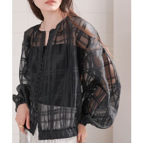 ハリ感のあるシアーチェック素材を使用した春らしいブルゾンの登場です!ベーシックなカラーリングながらも存在感のあるシアーチェックは軽やかな印象を与えてくれる1着。お袖や身頃のボリューム感はゆったり着用できる上、お袖をたくし上げることでぽわんとしたシルエットを醸し出してくれます。フロントはトレンドのホックを使用しており部分的に留めて抜け感を出しながらご着用いただきたいアイテムです。
