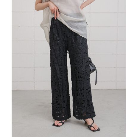 パンツ全体がクロシェ編みになったシーズンムードの高まるアイテム。ウエストはゴム仕様になっているのでノンストレスな着心地。ストレッチ性の高い裏地で動きやすさもあり、デザイン性と可動性を両立させた1枚。シンプルなコーディネートがお好きな方にも挑戦しやすいベーシックカラーでの色展開になっています。