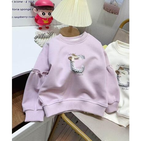 イエロー、オフホワイト、ピンクの3色展開で、胸元に「C」の刺繍とリボン飾りが可愛らしいキッズ用スウェットです。袖にはギャザー風のデザインが施されており、シンプルながらもおしゃれな雰囲気。柔らかく保温性が高いため、寒い冬でも快適に過ごせます。日常使いから特別なシーンまで幅広く活躍するアイテムです。