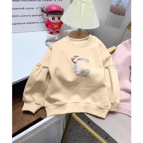 イエロー、オフホワイト、ピンクの3色展開で、胸元に「C」の刺繍とリボン飾りが可愛らしいキッズ用スウェットです。袖にはギャザー風のデザインが施されており、シンプルながらもおしゃれな雰囲気。柔らかく保温性が高いため、寒い冬でも快適に過ごせます。日常使いから特別なシーンまで幅広く活躍するアイテムです。