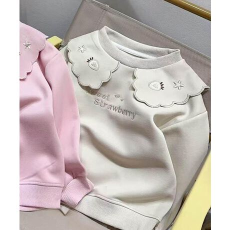 ピンク、モカ、オフホワイトの3色展開で、襟元の花型デザインと刺繍が特徴のキッズ用スウェット。可愛らしいデザインで秋冬シーズンにぴったりの一着です。柔らかい肌触りと保温性があります。ゆったりしたシルエットで動きやすく、デイリー使いから特別なお出かけまで幅広いシーンで活躍します。