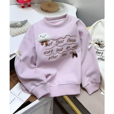 ピンクとオフホワイトの2色展開で、胸元に可愛らしい雲の飾りと英字刺繍が特徴的なキッズ用スウェット。袖にはリボンのアクセントがあり、ガーリーで温かみのあるデザインが魅力です。柔らかく保温性があり、冬の寒い季節にも着用いただけます。リラックスしたシルエットで動きやすく、デイリーからお出かけコーデまで幅広く活躍します。