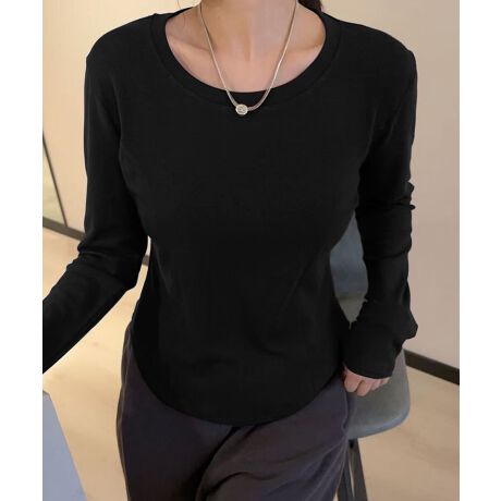 丸みを帯びたネックラインとフィット感のあるシルエットが特徴の長袖トップス。柔らかい生地が体に優しくフィットし、着心地が良いアイテムです。シンプルながらもエレガントなデザインが、デイリーユースに最適です。