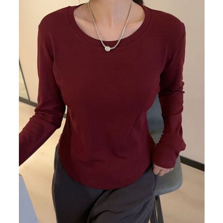 丸みを帯びたネックラインとフィット感のあるシルエットが特徴の長袖トップス。柔らかい生地が体に優しくフィットし、着心地が良いアイテムです。シンプルながらもエレガントなデザインが、デイリーユースに最適です。