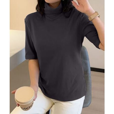 スタイリッシュなハイネックデザインが特徴のトップス。肩と胸元はフィット感があり、身体にぴったりと馴染むシルエットが魅力です。シンプルでありながら、上品さがあります。