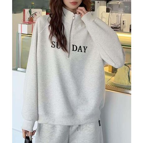 「SUNDAY」のロゴがプリントされたシンプルでスタイリッシュなハーフジップ。ゆったりとしたシルエットで、リラックス感のある着心地。フード付きデザインでカジュアルコーデにぴったりなアイテムです。