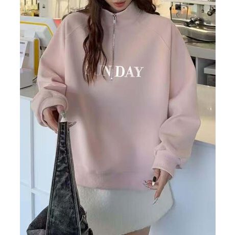 「SUNDAY」のロゴがプリントされたシンプルでスタイリッシュなハーフジップ。ゆったりとしたシルエットで、リラックス感のある着心地。フード付きデザインでカジュアルコーデにぴったりなアイテムです。