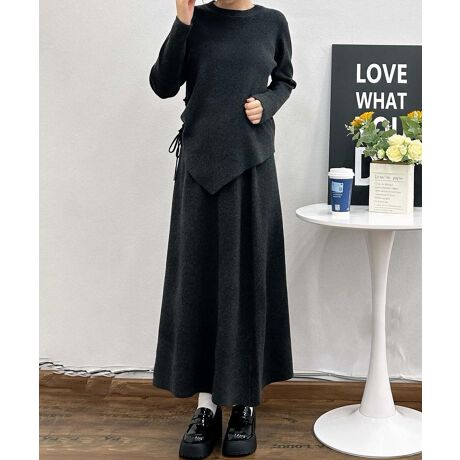 アシンメトリーな裾のデザインが特徴的なニットトップスと、シンプルなロングスカートのセットアップです。トップスはサイドの紐でシルエットを調整でき、様々な着こなしを楽しめます。セットアップで着るのはもちろん、それぞれ単品でも着回しがきくアイテムです。