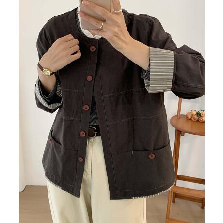 爽やかなカジュアルスタイルが楽しめるジャケット。無地のシンプルなデザインに、袖口のストライプ柄がさりげないアクセントを添えています。ゆとりのあるシルエットで、軽やかな着心地を実現。シンプルなボタンとポケットが付いており、実用性とスタイリッシュさを兼ね備えた一着です。