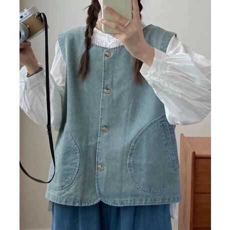 カジュアルなデニム風デザインのノースリーブベストです。前ボタン仕様で簡単に着脱が可能で、丸みを帯びた大きなポケットがアクセントになっています。リラックス感のあるシルエットで、インナー次第で多彩なスタイルが楽しめるアイテムです。